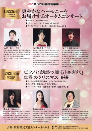 第52回福山音楽祭 ピアノと朗読で贈る「音ぎ話」 世界のクリスマス物語第52回福山音楽祭 爽やかなハーモニーをお届けするオータムコンサート棟方志功展 会期中イベント 満月ロビーコンサート棟方志功展 棟方志功記念館コレクションから