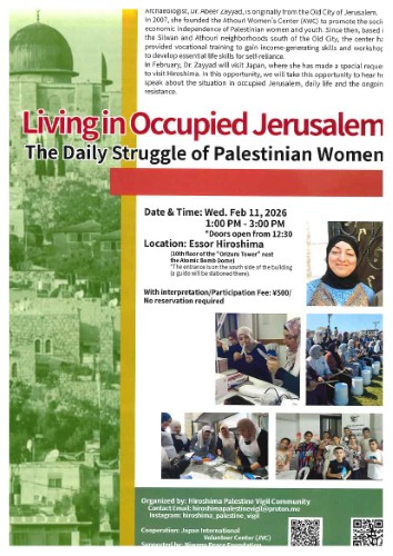 エルサレム旧市街出身の考古学者、アビール・ザイヤードさん。彼女は2007年、パレスチナの女性や育少年の社会的経済的自立をめざし、AWC(アットウーリー女性センターAthouri Women's center)を立ち上げました。以後、旧市街南に位置するシルワーン地区とアットゥーリー地区を拠点とし、収入獲得手段を得るための職業技術訓練、自立に必要なライフスキルを身につけるための研修などを実施しています。このたび来日が決まったアビールさんは、広島への訪問も希望されました。占領下のエルサレムの状況と日々の暮らしや抵抗について、この機会にアビールさんからじっくりお話を伺います。 |
