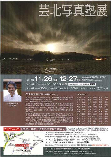 芸北写真塾展を結成して9年。毎年春には千代田のサンクスの「ギャラリー森」写真展を開催、県美展入賞や二科展入賞、各種コンテストに入賞するなど次第に力を付けてきた。求め続けるのは時代を記録すること。そして古い日本の美意識を意識の真ん中にして撮影していけばいいと考える。塾の人たちの平均年齢は60歳を少しだけ超えた写真大好き集団。合言葉は「魂に加齢はない」。