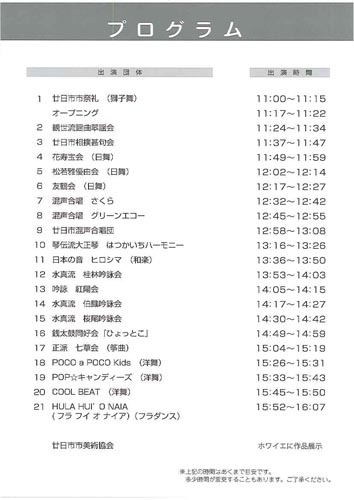 ステージ:謡曲・箏・獅子舞・相撲甚句・銭太鼓・邦楽・詩吟・日舞・洋舞・大正箏・コーラス