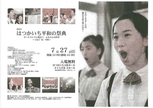 四季が丘小学校合唱団(合唱)、四季が丘小学校合唱団&ムジークシュトラーセン(合唱)、音訳ボランティアグループつばさ(朗読)、さくらぴあ市民オペラ管弦楽団(全体合唱)、はつかいち平和の祭典合唱団(全体合唱)、松本憲治(指揮)、中田知加(ピアノ)、ト部絢子(ピアノ)