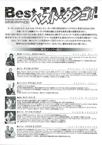 カルロス・ルルフィ(指揮・バンドネオン)、ダニエル・ビアカバ(ピアノ)、ラファエル・フェリ(コントラバス)、カリナ・リベーラ(歌手)、ウーゴ&アンドレア(ダンサー)、ハビエル&サブリナ(ダンサー)