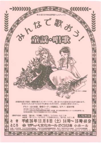 歌唱予定曲:(唱歌)「朧月夜」「早春賦」「村祭り」「ふじの山」など17曲/(童話)「背くらべ」「七つの子」「十五夜お月さん」「浜千鳥」など11曲 |