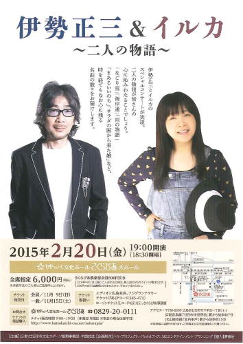 伊勢正三とイルカのスペシャルコンサートが実現。二人の物語が皆さんの心にしみわたることでしょう。「なごり雪」「海岸通」「雨の物語」「まあるいいのち」「サラダの国から来た娘」など、時を経てもなお心に残る名曲の数々をお届けします。 |