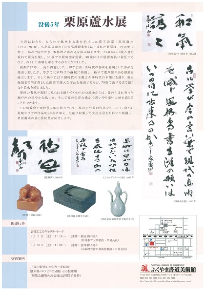 広島県福山市に生まれた漢字書家・栗原蘆水(1931−2010)の没後5年の節目として、福山初公開の作品を中心に17歳から最晩年までの作品約40点と、収集した文房至宝を同時に展観し、栗原蘆水の書と愛玩品を紹介する