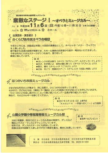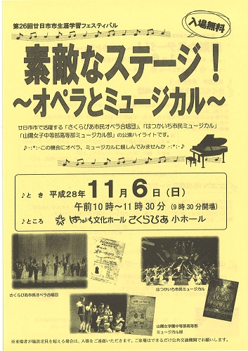 廿日市市で活躍する「さくらぴあ市民オペラ合唱団」、「はつかいち市民ミュージカル」「山陽女子中等部高等部ミュージカル部」の公演ハイライトです |