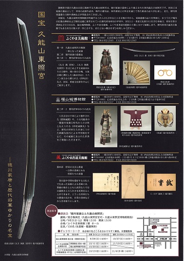 久能山東照宮博物館が所蔵するこれらの2200点に上る宝物の中から、家康遺愛の品々を筆頭に、かつて江戸城内の紅葉山神庫および御具足蔵に保管されていた歴代将軍所用の甲冑や、国宝1口・重要文化財10口を含む奉納刀、将軍自筆の書画などの140点を、福山城博物館、ふくやま美術館、ふくやま書道美術館の3館に分けて展観します