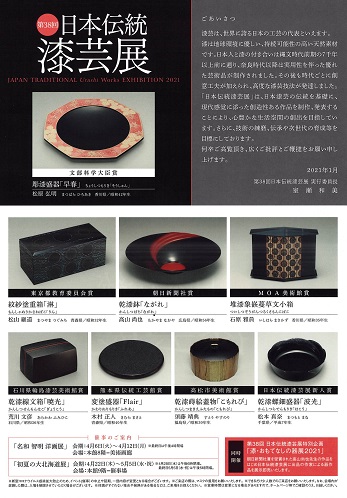 <趣旨>我が国には世界に卓越する工芸の伝統があります。特に漆芸は日本を代表する工芸として、古くから芸術的にも、技術的にも高度の発達をしてきました。この貴重な伝統を継承し、一層錬磨するとともに、現代に生かすことは、我々に課せられた責務であると信じます。ここに、伝統工芸の精神にそって、今日の生活に則した創意ある作品を展示し、広く人々の御清鑑を仰ぎ、漆芸の健全な発展に寄与しようとするものであります。 |