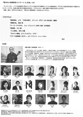 アンサンブル・ノマド音楽監督で長年エリザベト音楽大学で講師をしていた佐藤紀雄が、門下生と音楽仲間を集めて開催するコンサートです。広島に縁がある作曲家の作品や、子どもたちと一緒に演奏する曲目も取り上げます。