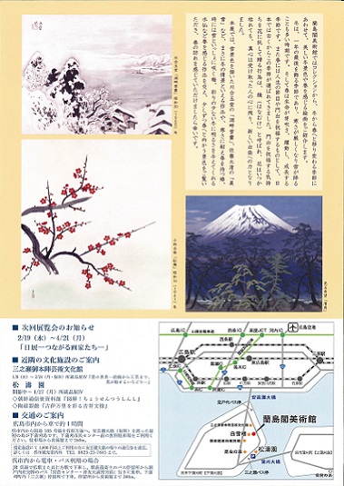 本展では、雪景色を描いた河合玉堂の「湖畔雪霽」、佐藤太清の「晨雪」など、まさに冬の情景と言える作品や、寒さに耐え春を待つ椿、時には雪といっしょに咲く梅、彩りの少ない冬に明るさを与えてくれる水仙など春を感じる作品を交え、少しずつ春へと向かう景色をご覧いただき、春の訪れを感じていただけましたら幸いです。 |