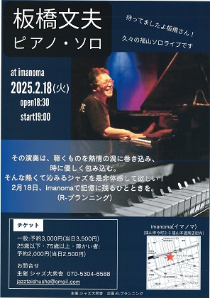 その演奏は、聴くものを熱情の渦に巻き込み、時に優しく包み込む。そんな熱くて沁みるジャズを是非体感して欲しい!2月18日、imanomaで記憶に残るひとときを。 |
