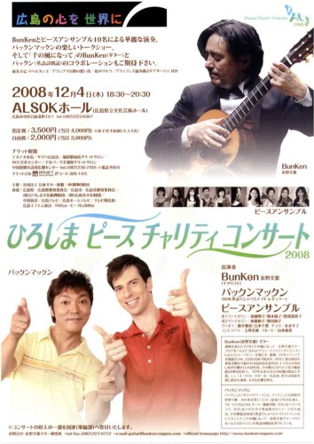 Bunkenとピースアンサンブル10名による華麗な演奏、パックンマックンの楽しいトークショー、そして「千の風になって」のBunken(ギター)とパックン(英語詩朗読)のコラボレーションもご期待下さい。 |