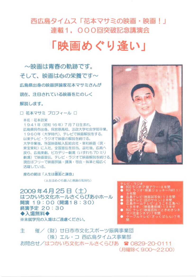 広島県出身の映画評論家花本マサミさんが現在、注目されている映画をたのしく解説します。 |