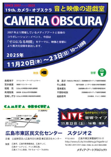 2007年より開催しているメディアアートと音楽のコラボレーションイベント。「音と映像の遊戯室」をテーマに新しい主題と表現の実験を続けてきました。近年では広島を拠点とする映像チームと、京都精華大学教員を中心にした音響チームが協同で作品を制作しています。19回目を迎える今回は「ゼロになる時間」を主題に、各アーティストが新しい技術で音と映像により異次元空間を生み出します。ぜひ会場で未知の感覚を体感してください!