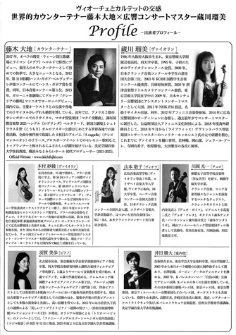 藤木大地 (カウンターテナー)、蔵川瑠美 (ヴァイオリン)、木村紗綾(ヴァイオリン)、山本敬子(ヴィオラ)、川岡光一(チェロ)、羽賀美歩(ピアノ)、井田勝大(案内役)