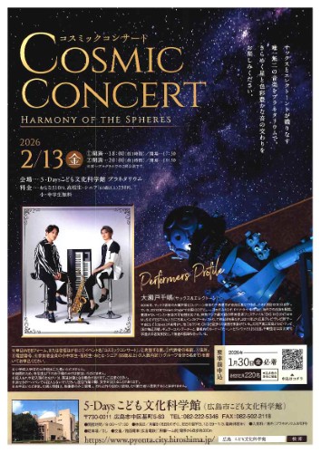※申込WEBフォームまたは、往復はがきに(1)イベント名「コスミックコンサート」、(2)希望する回、(3)代表者の名前、(4)住所、(5)電話番号、(6)参加者全員の小中学生・高校生・おとな・シニア(65歳以上)の人数内訳(1グループ合計5名まで)を書いてお申し込みください。